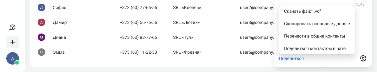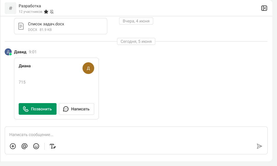 • Поделиться контактом в чате — в чате отобразится краткая карточка контакта с кнопками вызова и отправки сообщения (если это внутренний контакт).