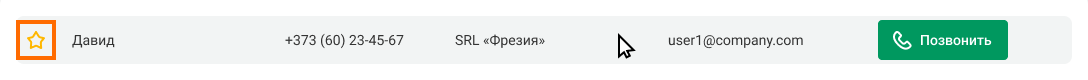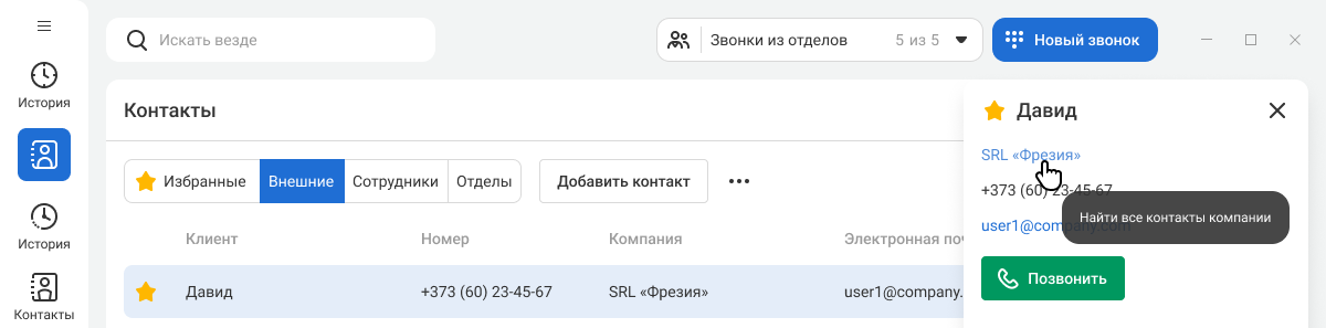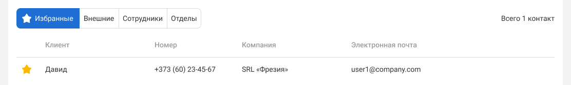 Чтобы найти нужный контакт, в поисковой строке начните писать значение одного из полей: имя, номер, e-mail контакта или название компании.