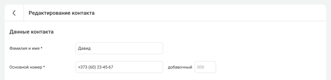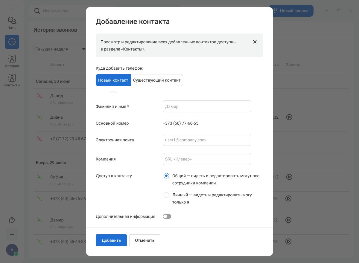 Введите основные данные о клиенте: ФИО, дополнительные телефонные номера, электронную почту, название компании. Также укажите, кто должен видеть этот контакт — только вы или все пользователи АТС.