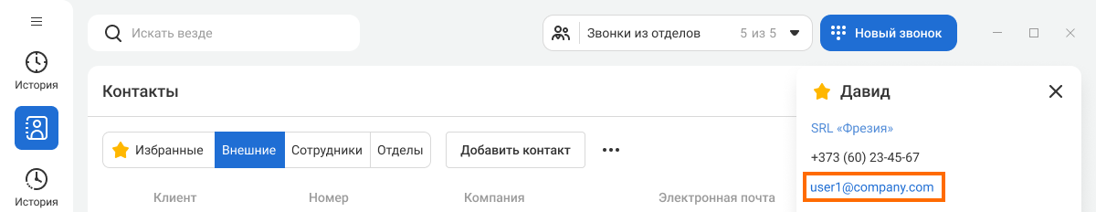 Чтобы ускорить процесс отправки e-mail контакту из АТС, нажмите на адрес электронной почты контакта в его карточке.