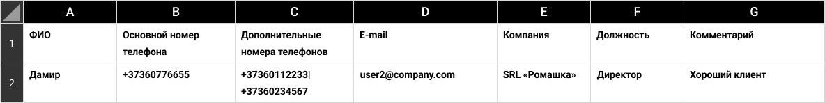 2. Скачайте шаблон файла Excel с примером заполнения списка контактов.