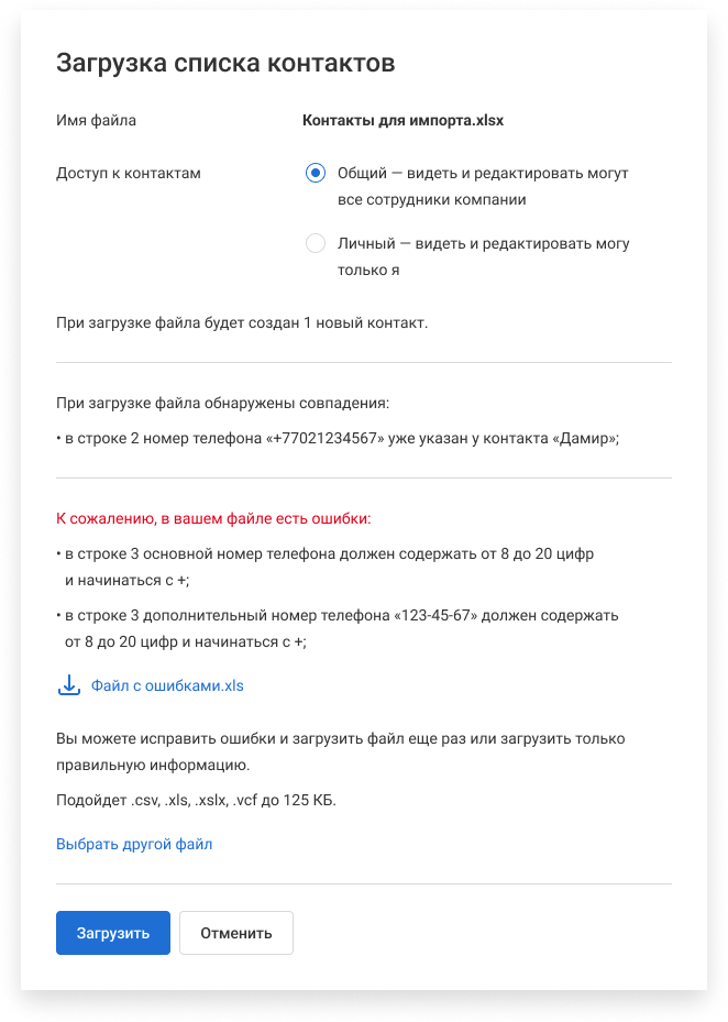 При загрузке xsl-файла с контактами может возникнуть два типа ошибок: