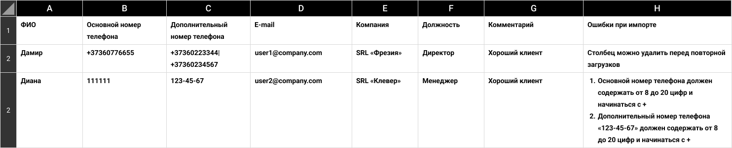 • Ошибки в самих контактах — в таком случае можно импортировать в АТС контакты, оформленные корректно, и скачать файл с ошибками.