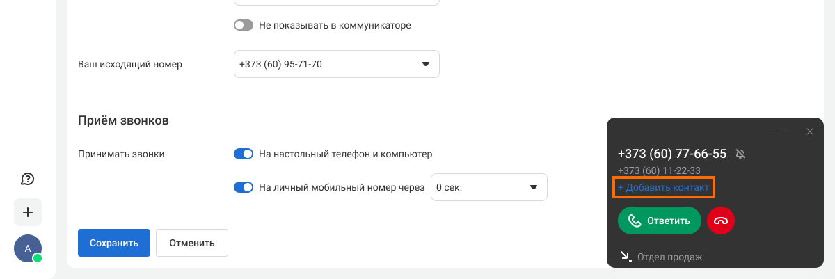 Если вы созваниваетесь с тем, кого нет у вас в контактах, и хотите добавить контакт, не дожидаясь окончания звонка, то в карточке звонка нажмите на кнопку «Добавить контакт».