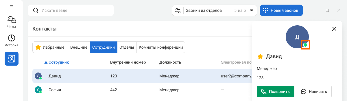 Чтобы узнать, доступен ли коллега для оперативной связи, обратите внимание на статус его присутствия в мессенджере. Этот статус отображается в карточке сотрудника, также его можно посмотреть в списке чатов.