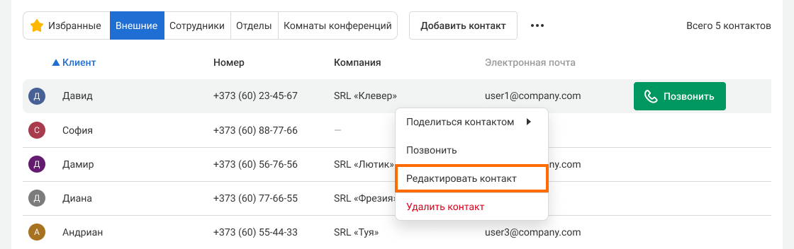 В списке контактов нажмите правую кнопку мыши, выберите «Редактировать контакт» или «Удалить контакт».