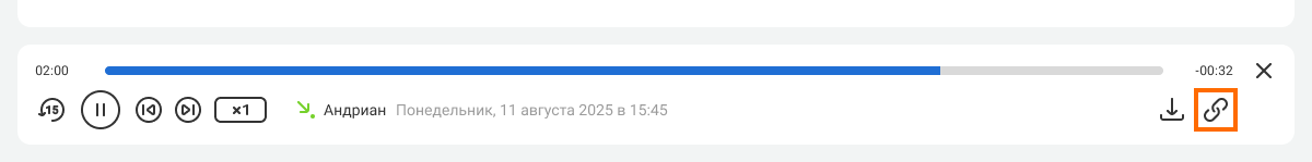 Чтобы поделиться записью звонка в чате, в проигрывателе нажмите на иконку ссылки в правом нижнем углу.
