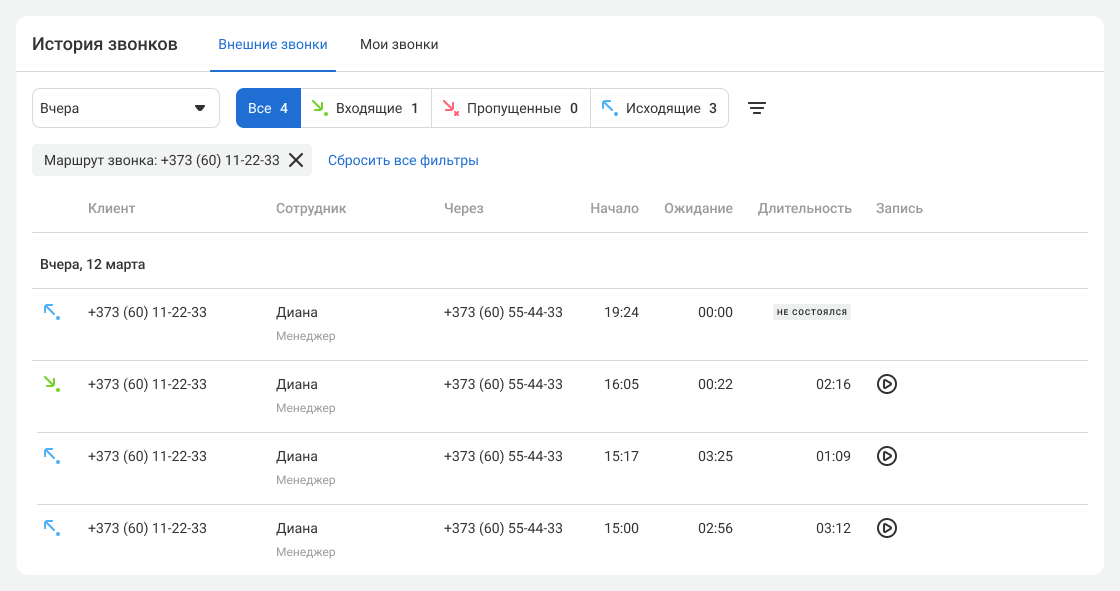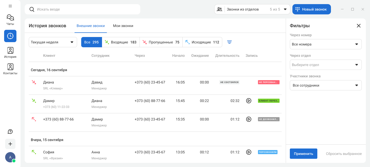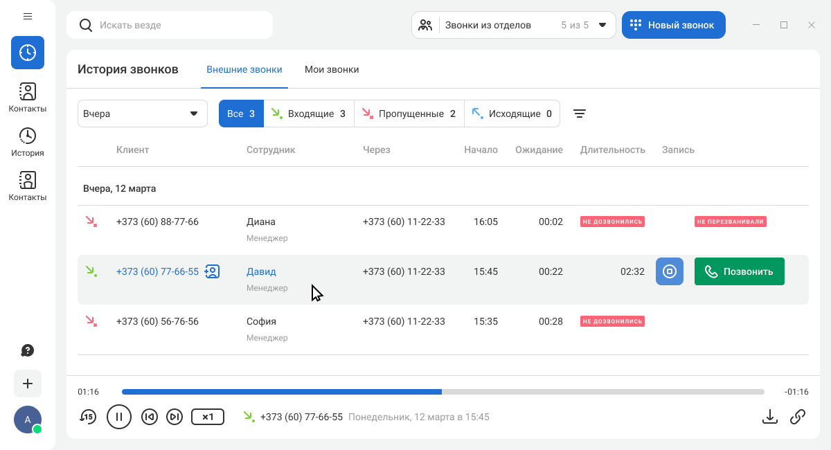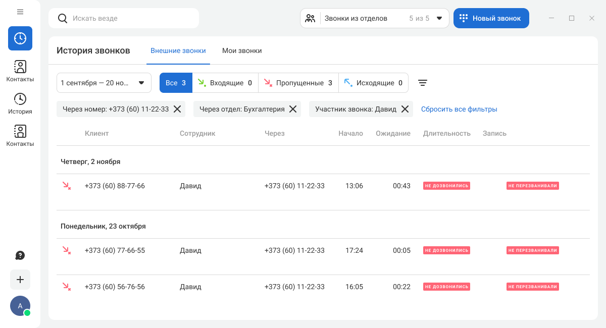Благодаря фильтру «Контроль пропущенных» вы сможете легко найти непринятые звонки, на которые сотрудники не перезванивали или не дозвонились.