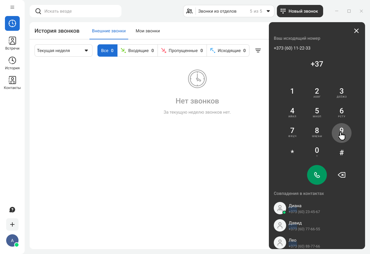 • в верхнем меню — найти нужный контакт или канал, управлять приемом звонков из отделов, в которых вы состоите, а также звонить через панель набора номера.