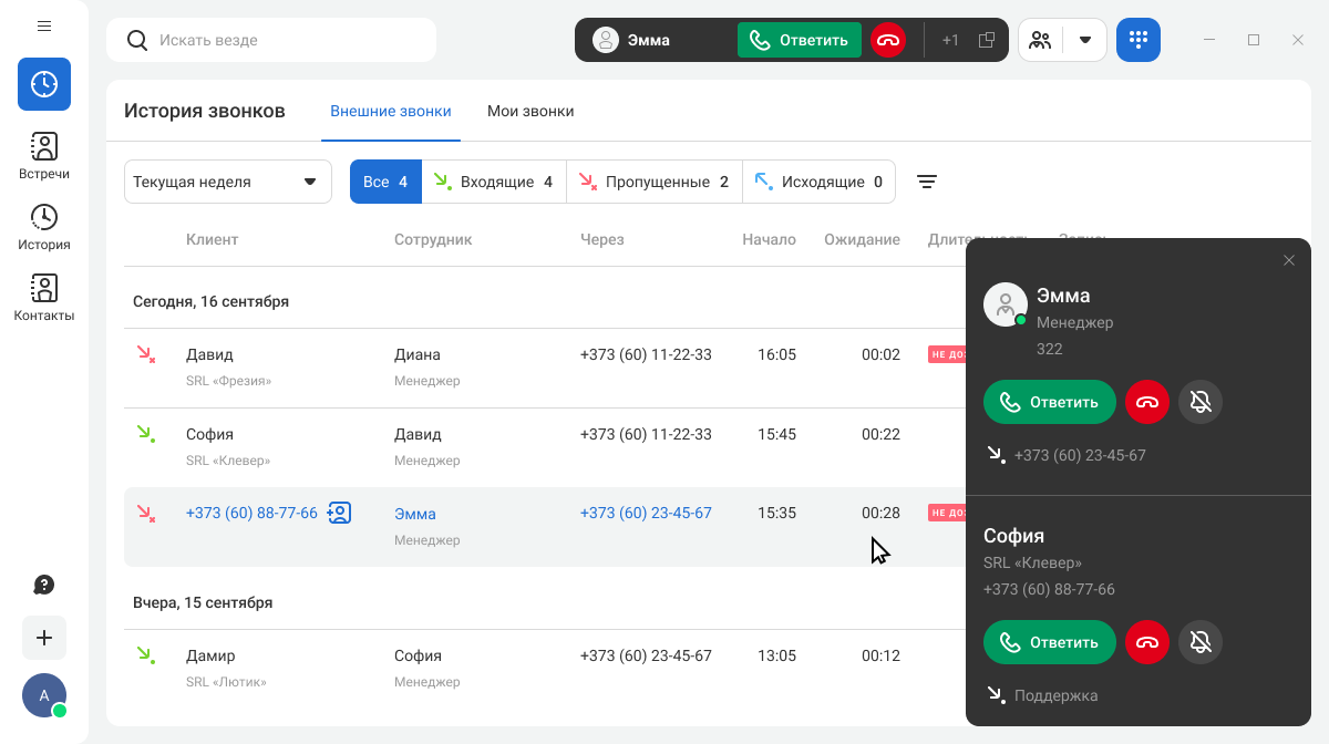 В истории звонков вы сможете узнать больше о контакте и быстро ему перезвонить. Гибкая система фильтров помогает найти любой звонок в архиве и при необходимости прослушать его запись.