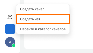 Чтобы начать переписку с коллегой в мессенджере, нажмите на иконку плюса в боковом меню. Выберите «Создать чат».