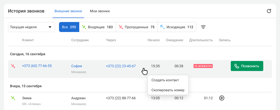 При переходе в историю новый пропущенный звонок подсвечивается красным. Уведомление исчезает, если долго держать вкладку с новым пропущенным открытой или если кто-то из сотрудников перезвонит этому контакту.