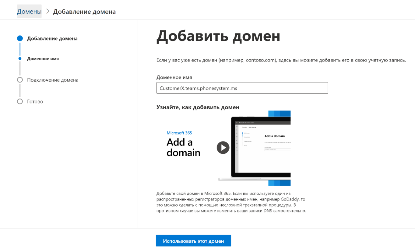 Для интеграции необходимо получить домен в зоне *.teams.phonesystem.ms, который будет использован для подключения вашей Виртуальной АТС.Запросите у нашего менеджера такой домен. Обычно вместо * указывается название вашей компании. Например, если ваша компания называется ООО «Ромашка», то вы получите домен romashka.teams.phonesystem.ms.