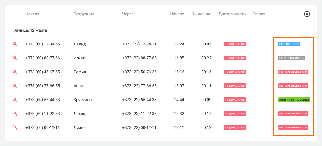 Рекомендуем сразу обращать внимание на красные метки. Так вы сможете понять, какие звонки в первую очередь требуют внимания менеджера.