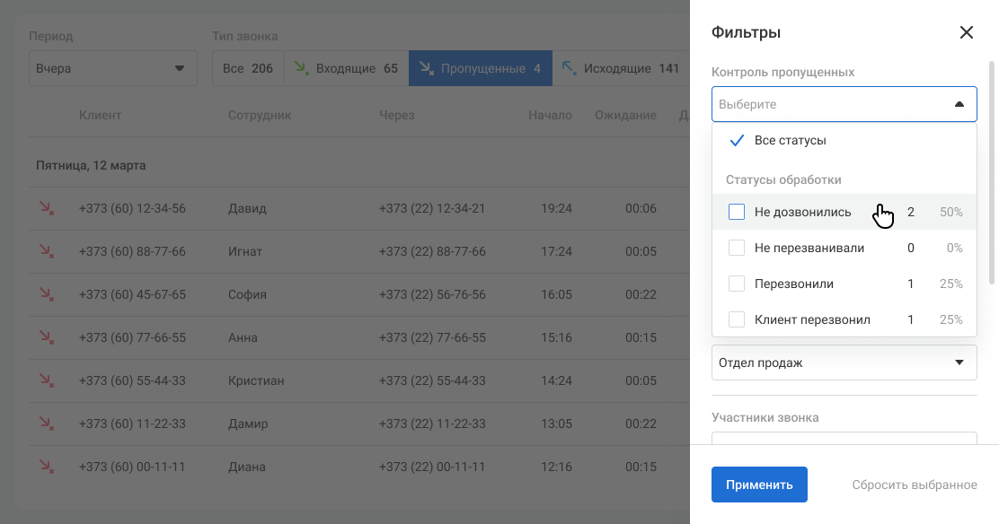 3. Отслеживайте работу менеджеров по неотвеченным звонкам с помощью фильтров: