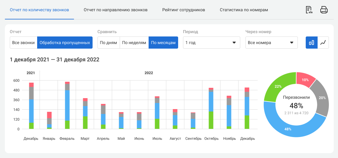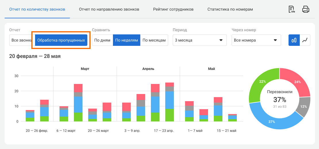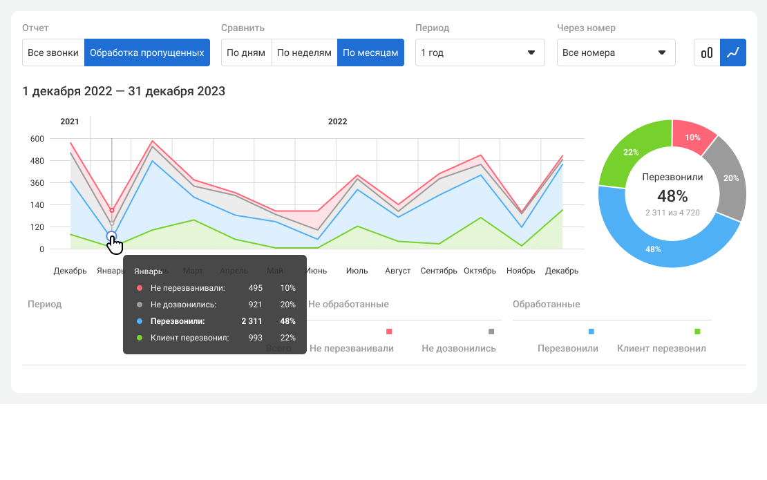 Благодаря визуализации данных, вы сможете оценить, как меняется соотношение обработанных и необработанных пропущенных за выбранный период и организовать активность менеджеров так, чтобы они эффективнее работали во время различных форс-мажоров.