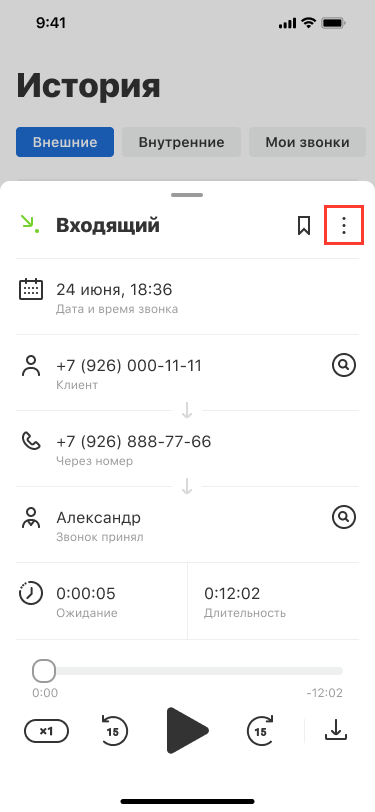 Чтобы перезвонить из карточки звонка, нажмите на нужную запись в «Истории». В карточке звонка нажмите на три точки в правом верхнем углу.