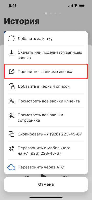 В открывшемся меню выберите «Поделиться записью звонка».