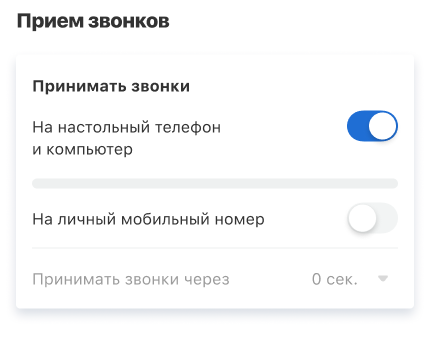 Если сотрудник чаще находится на рабочем месте и сразу может ответить с настольного телефона или компьютера, рекомендуем настроить задержку перед переадресацией звонка мобильный. Так, звонок сначала поступит на офисные устройства, а лишь затем на личный мобильный номер. Под нужным способом приема звонков нажмите «Принимать звонки через» и выберите комфортную задержку для переадресации.