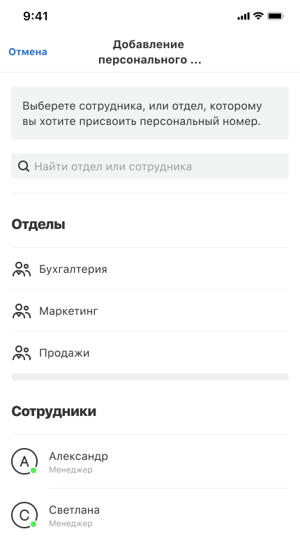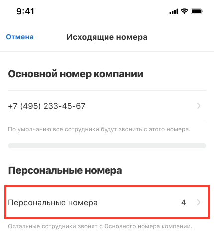 • Персональных номеров — подставляются при исходящих звонках выбранных сотрудников и отделов. Это позволяет менеджерам всегда звонить клиентам со знакомых номеров.