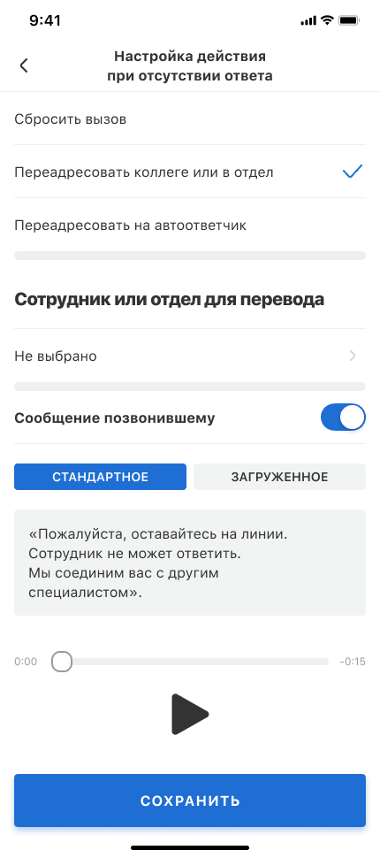 Выберите что делать с входящими звонками. Перевод и аудиосообщение для позвонившего настраиваются также, как описано выше в разделе «Переадресация входящих если сотрудник долго не отвечает».