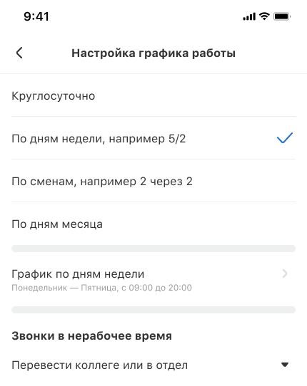 Гибкие настройки расписания сотрудника позволят один раз отрегулировать прием звонков в рабочее и нерабочее время и не вспоминать об этом до тех пор, пока график работы менеджера не изменится.