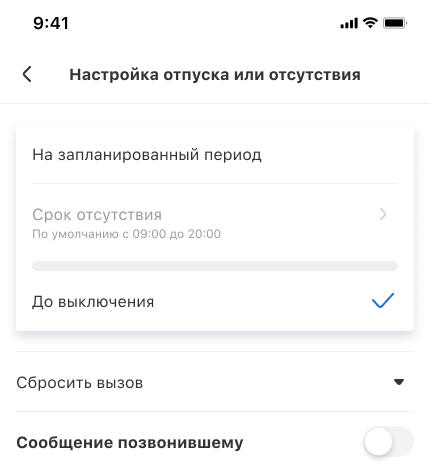 Откройте профиль сотрудника в мобильном приложении: «Настройки» — «Личные настройки» — «Мой профиль». Найдите блок «Если вы не отвечаете» и нажмите на настройку под ним.