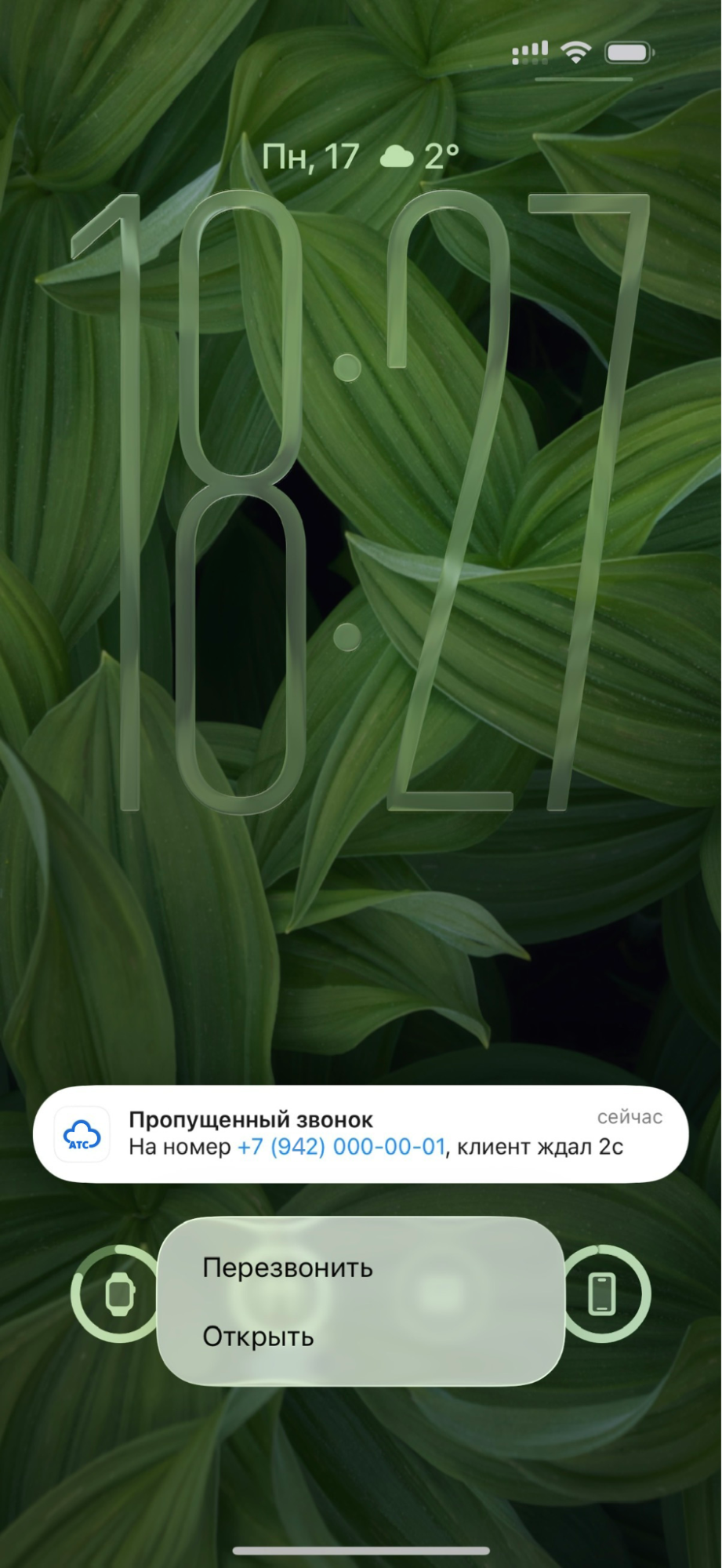 • Для iOS долгое нажатие на push-уведомление вызывает всплывающее меню. Чтобы начать звонок, выберите «Перезвонить». Пункт «Открыть» открывает карточку звонка.