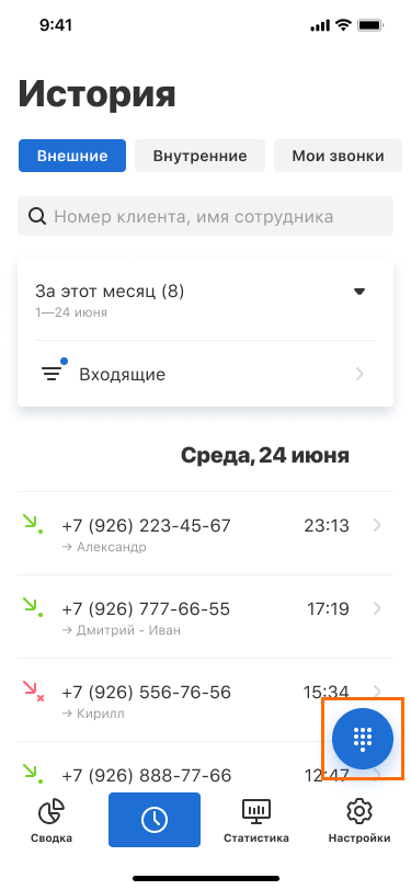 Чтобы начать звонить и принимать звонки, воспользуйтесь круглой кнопкой в правом нижнем углу. Она появляется в разделах «Сводка», «История», «Статистика».