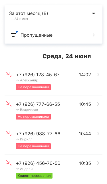 • включить push-уведомления о пропущенных, чтобы максимально быстро перезванивать клиентам;