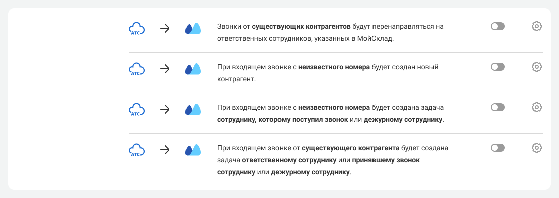 10. Настройте сценарии (правила) интеграции сервиса МойСклад и Виртуальной АТС. Некоторые сценарии интеграции подключаются автоматически без возможности внести в них изменения.