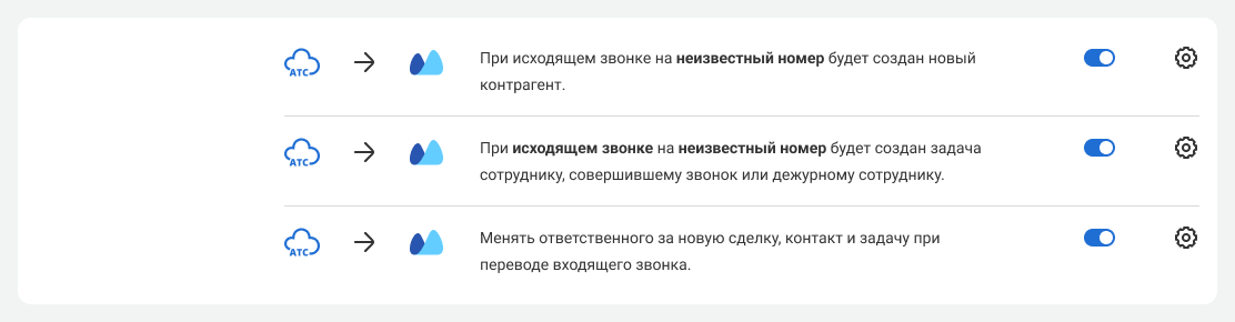 • после звонка с участием неизвестного номера (успешного и неуспешного, входящего и исходящего) могут быть автоматически созданы новый контрагент и задача на сотрудника;