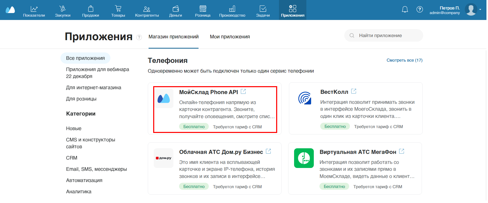 3. В личном кабинете сервиса МойСклад зайдите в меню «Приложения», в разделе «Телефония» найдите приложение «МойСклад Phone API». Нажмите «Установить».