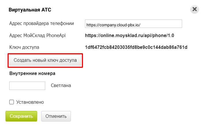 6. Вернитесь в интерфейс Виртуальной АТС и в поле «Ключ доступа» вставьте скопированный ключ.