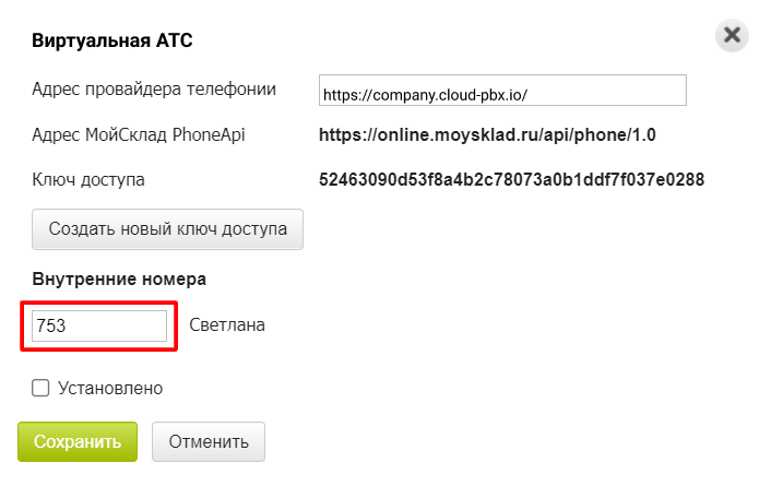 7. Перейдите в интерфейс МойСклад и сопоставьте пользователей Виртуальной АТС и сервиса МойСклад, указав их внутренние номера.
