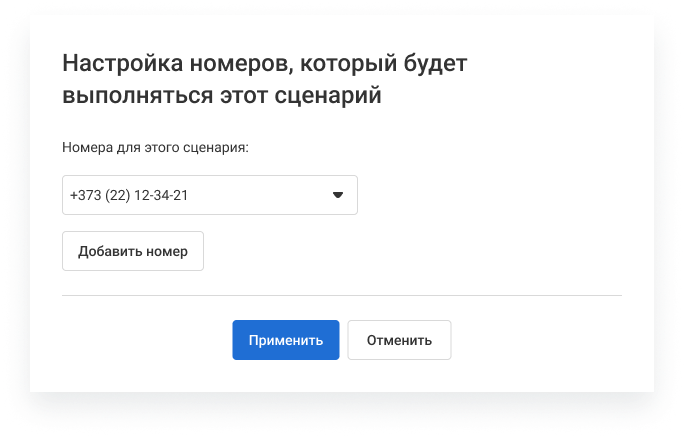 Если ваша компания использует несколько номеров, вы можете указать в настройках, на каких номерах будет работать интеграция с МойСклад. Для этого в разделе «Настроенные сценарии интеграции» нажмите кнопку «Добавить сценарий».