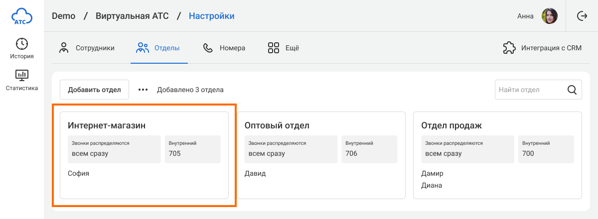1. Зайдите в «Настройки» – «Отделы» и выберите карточку нужного отдела.