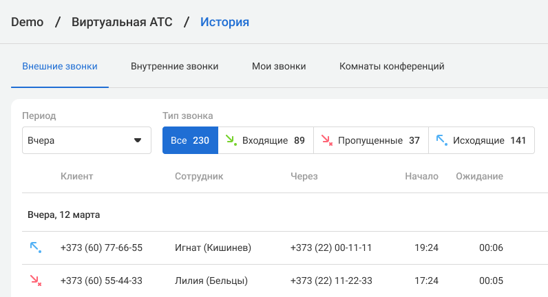 Теперь звонки вашего отдела, которые принял или совершил менеджер из другой АТС, будут отображаться в Истории → Внешние звонки, и их записи можно будет прослушать. В колонке «Сотрудник» в скобках будет указано название филиала, к которому относится менеджер, а в колонке «Через» — номер Виртуальной АТС, в которой настроен отдел с этим менеджером.