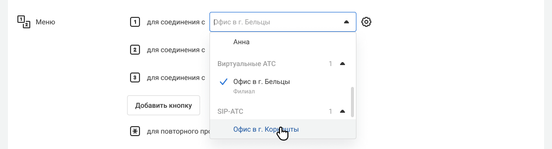 2. Откройте раскрывающийся список рядом с кнопкой, которую хотите назначить для перевода вызова на сотрудника из другой АТС. Найдите в списке блок «Виртуальные АТС», если хотите сделать сотрудника из другой ВАТС доступным через голосовое меню. Если хотите добавить внутренний номер сотрудника SIP-АТС — найдите блок «SIP-АТС».