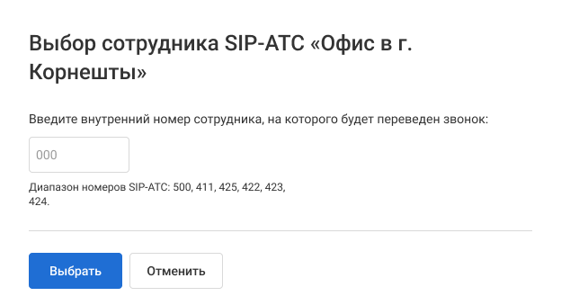 - Если это SIP-АТС, то введите внутренний номер сотрудника. Чтобы вам не пришлось искать его номер в настройках SIP-АТС, под окном ввода номера перечислен весь диапазон доступных номеров выбранной АТС.