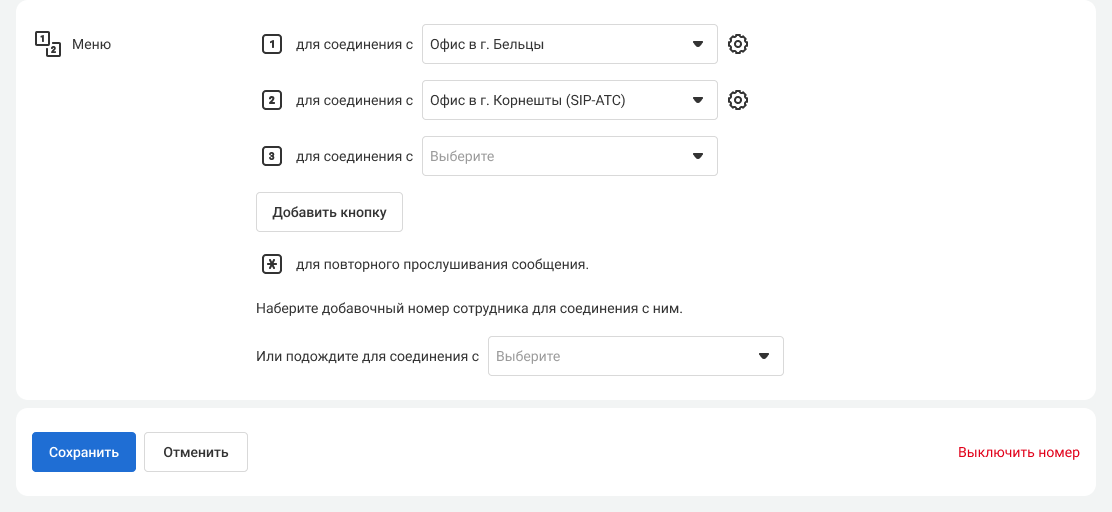 Можно добавить сотрудника из другой АТС в голосовое меню — для соединения с ним нужно будет набрать внутренний номер или выбрать направление звонка в IVR. Для этого: