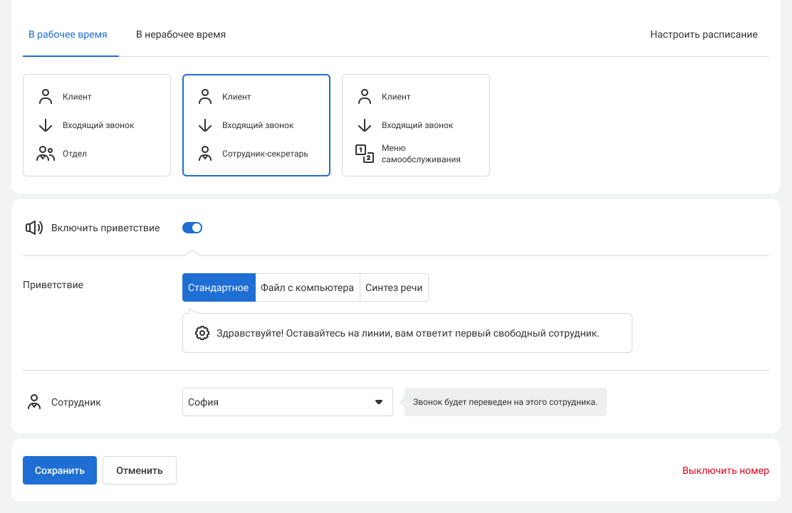 1. В настройках номера выберите режим работы «По расписанию» и перейдите на вкладку «В рабочее время». Выберите сценарий «Клиент – Входящий звонок – Сотрудник-секретарь».