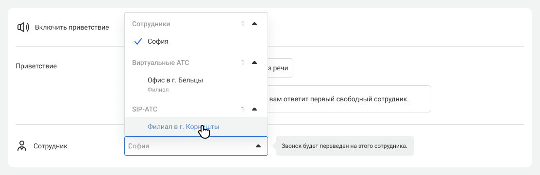 - Если это Виртуальная АТС, то выберите сотрудника в раскрывающемся списке.