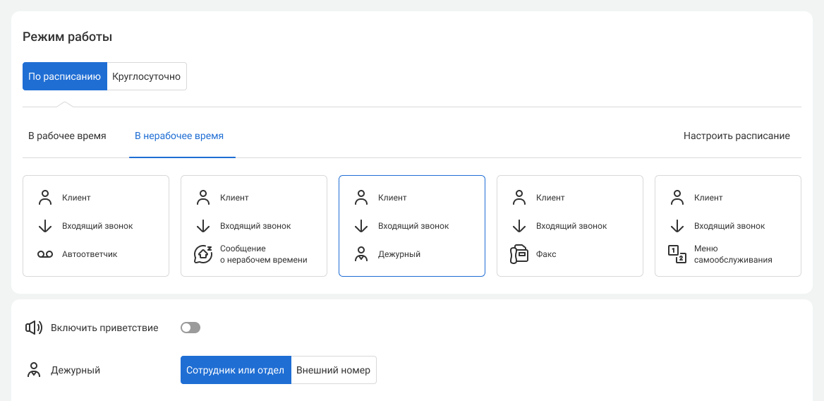 1.В настройках номера выберите режим работы «По расписанию» и перейдите на вкладку «В нерабочее время». Выберите сценарий «Клиент – Входящий звонок – Дежурный».