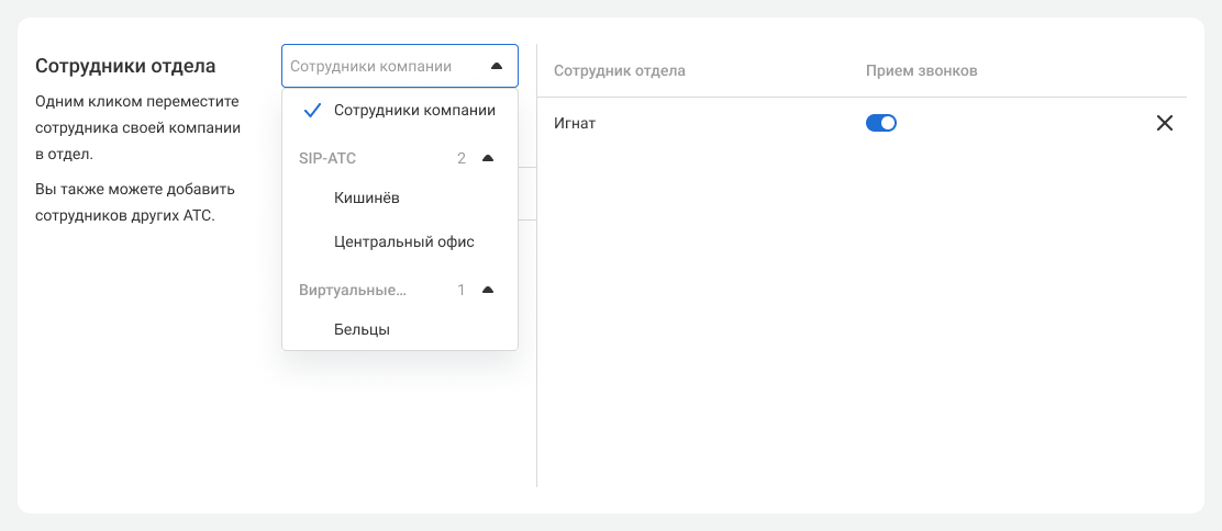 2. В блоке «Сотрудники компании» в раскрывающемся списке выберите нужную офисную или Виртуальную АТС.