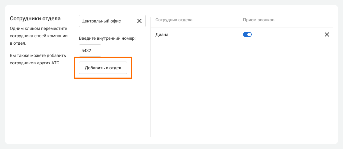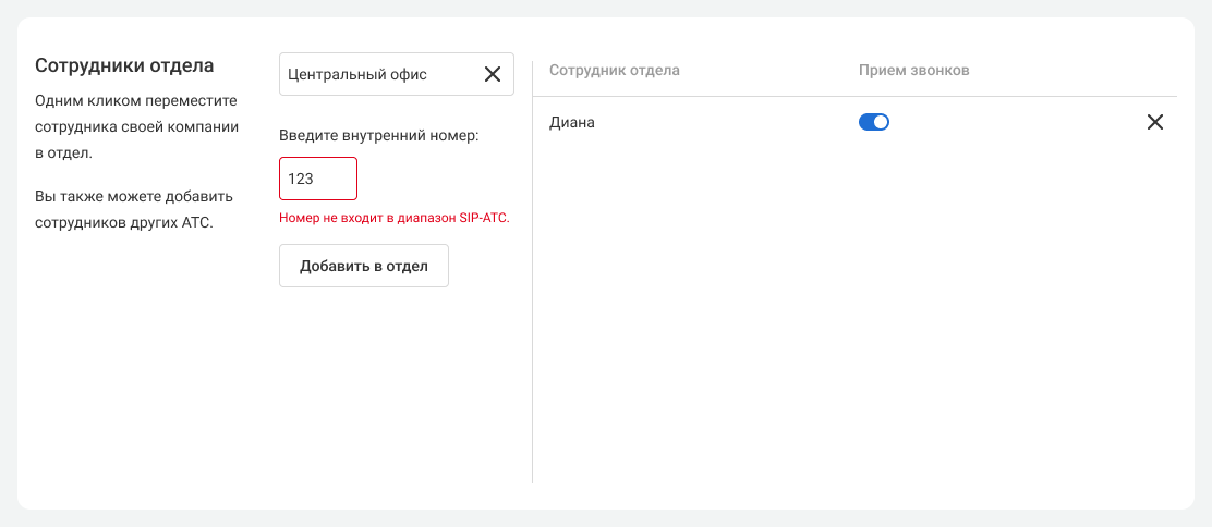 1. При выборе SIP-АТС ниже появится окно ввода внутреннего номера. Введите номер сотрудника, которого хотите добавить, и нажмите на кнопку «Добавить в отдел».