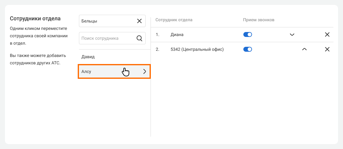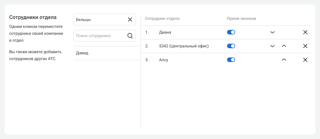 4. Вы можете изменить порядок приема звонков сотрудниками из других АТС, временно исключить их из этой очереди или вовсе удалить из отдела так же, как и любого другого менеджера ВАТС.