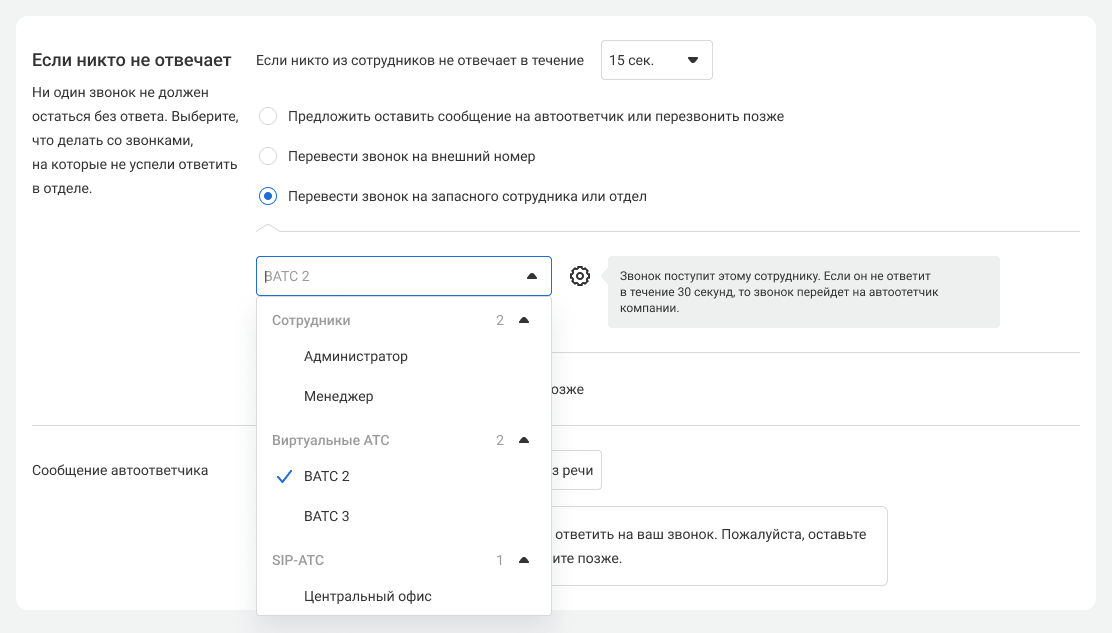Когда сотрудники отдела не отвечают в течение определенного количества времени, звонок можно переводить на запасного сотрудника или отдел (подробнее про настройки времени ожидания читайте в статье Гибкая настройка времени ожидания). Для этого в настройках отдела в блоке «Если никто не отвечает» нужно выбрать «Перевести звонок на отдел или запасного сотрудника». Чтобы использовать сотрудника другой АТС в качестве запасного, в раскрывающемся списке укажите другую АТС.