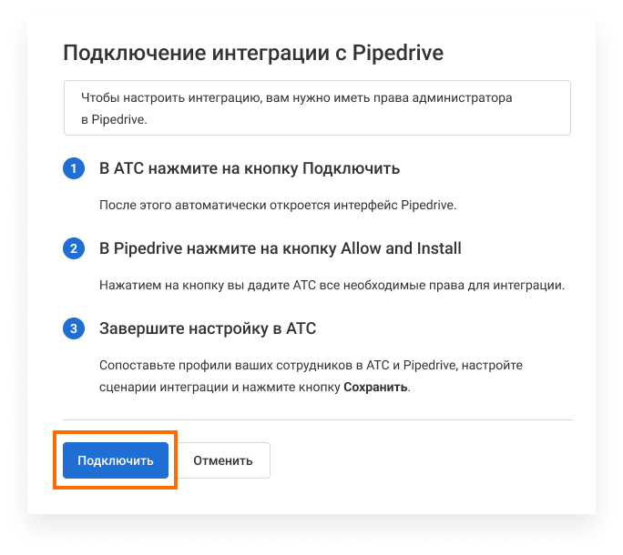 Чтобы настроить интеграцию, вам нужно иметь права администратора в Pipedrive.