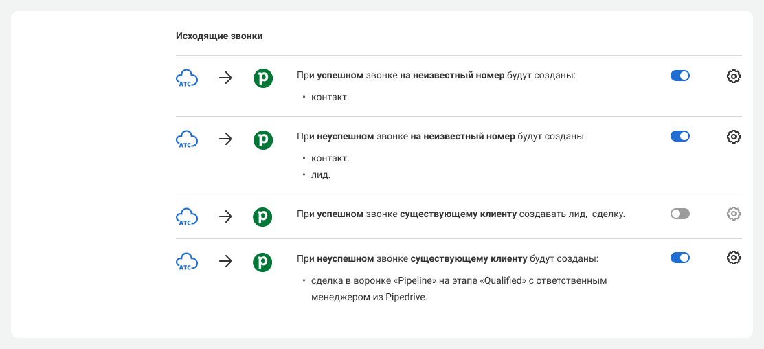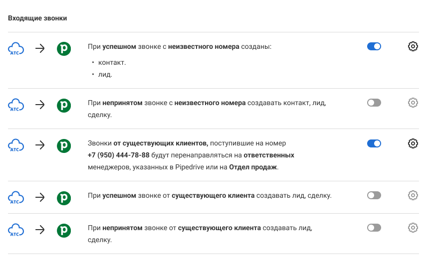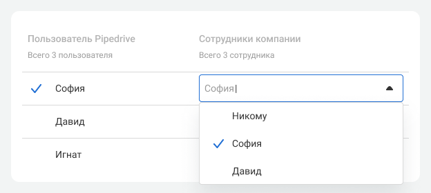 Если в будущем вы добавите новых сотрудников, не забудьте сопоставить их профили в АТС и Pipedrive в настройках интеграции в интерфейсе АТС.